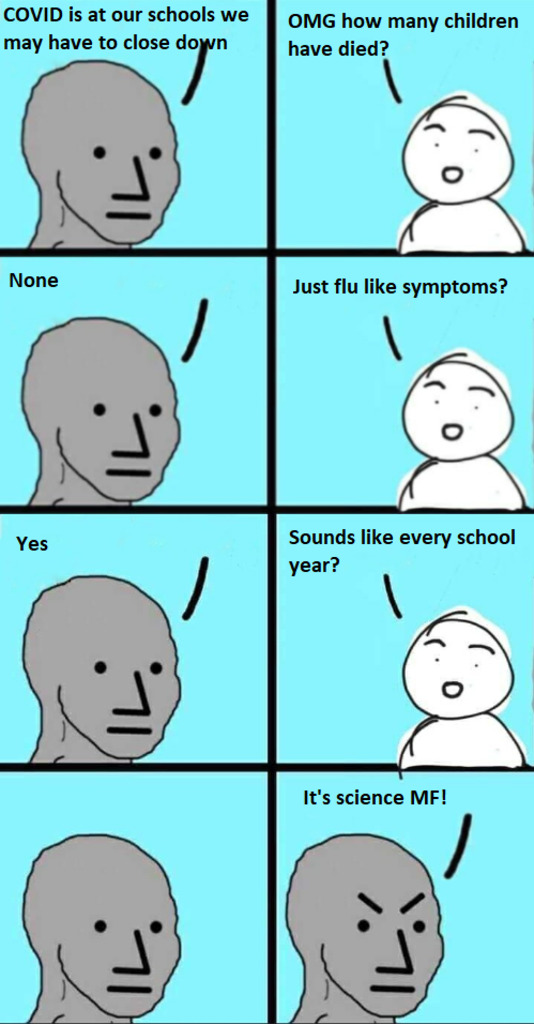 Unknown's avatarAuthor HP McLovincraftPosted on September 1, 2021Format ImageTags children, coronavirus, covid-19, education, npc meme, pandemic, public schools