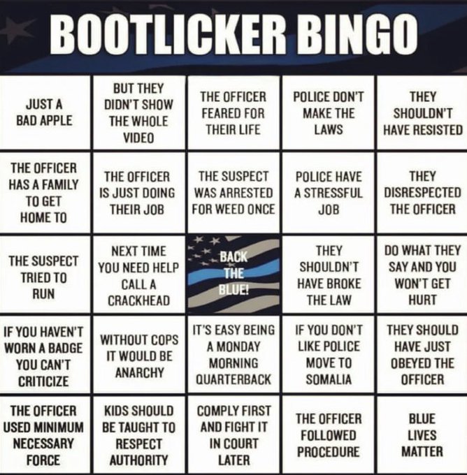 Unknown's avatarAuthor HP McLovincraftPosted on April 26, 2023Format ImageTags bluelivesmatter, bootlickers, police stateLeave a comment on Bingo!